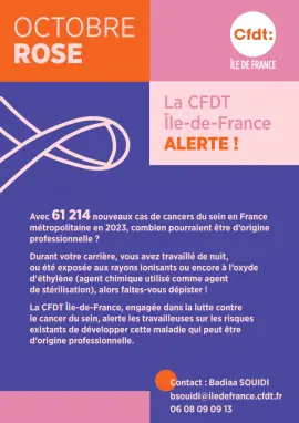 La CFDT Île-de-France, engagée dans la lutte contre le cancer du sein, alerte les travailleuses sur les risques existants de développer cette maladie qui peut être d’origine professionnelle.
