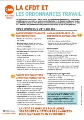 Les ordonnances réformant le Code du travail, promulguées en septembre 2017, bouleversent considérablement les règles en matière de droit du travail et de dialogue social en particulier. La CFDT a fait le choix de s’investir dans les réunions de concertation du printemps et de l’été 2017 pour faire des propositions et s’opposer aux dispositions qu’elle ne partageait pas.