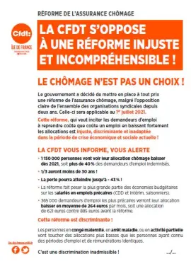 Le gouvernement a décidé de mettre en place à tout prix une réforme de l’assurance chômage, malgré l’opposition claire de l’ensemble des organisations syndicales depuis deux ans. Celle-ci sera applicable au 1er juillet 2021. Cette réforme, qui veut inciter les demandeurs d’emploi à reprendre coûte que coûte un emploi en baissant fortement les allocations est injuste, discriminante et inadaptée dans la période de crise économique et sociale actuelle !