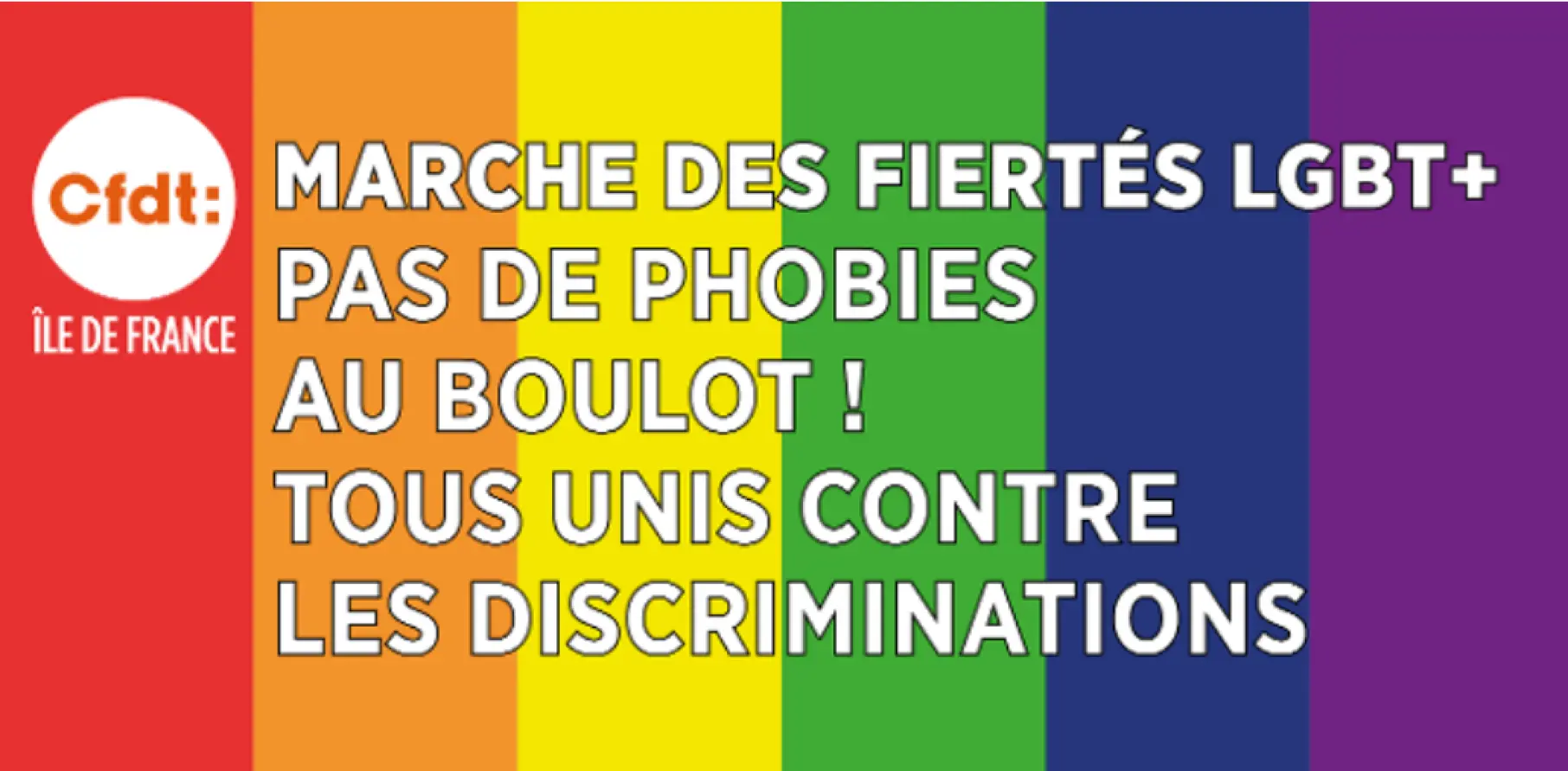 Comme chaque année, la CFDT Île-de-France revendique son combat contre l'homophobie, la transphobie et pour l'égalité de tous, en participant à la Marche des Fiertés lesbiennes, gaies, bi, trans et intersexes, au côtés de l'ensemble des acteurs engagés.