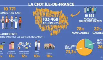 La CFDT est présente sur tout le territoire, aussi bien dans le public que dans le privé. En Île-de-France comme au niveau national, la CFDT est la 1ère organisation syndicale en Île-de-France. Elle est aussi la 1ère organisation parmi les cadres. La CFDT compte plus de 134000 adhérents et plus de 15000 sections syndicales dans la région, dans tous les champs professionnels, dans des entreprises et les administrations.