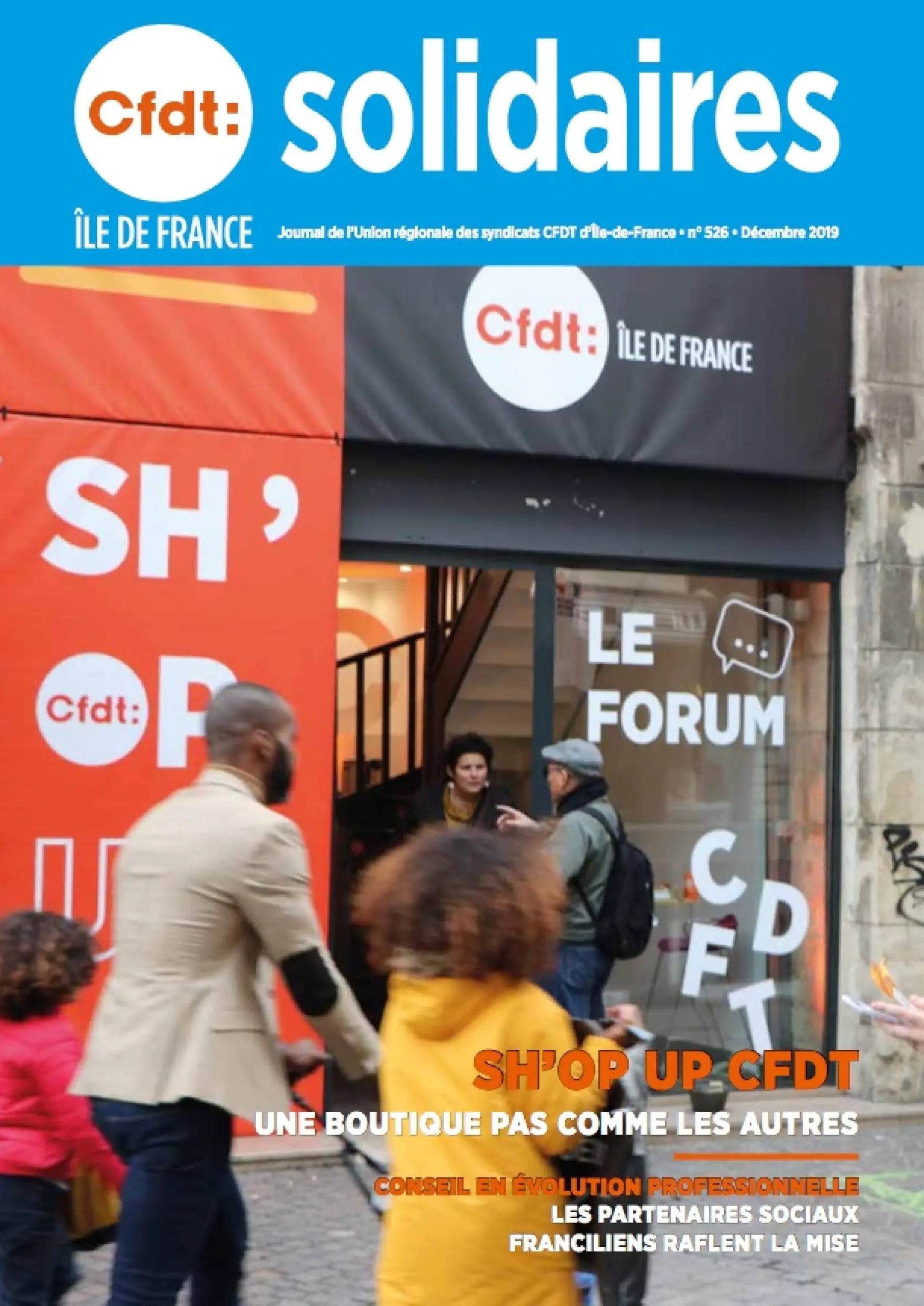 Solidaires consacre dans son numéro de fin d'année un dossier complet sur le Conseil en évolution professionnelle. Avec la loi Avenir professionnel (2018), ce service d'accompagnement des actifs n'est plus délivré par les Fongecif. En île-de-France, c'est un groupement associant les partenaires sociaux qui a remporté l'appel d'offres de France compétences et qui sera en mesure, dès le 1er janvier 2020, d'accompagner les salariés dans leur évolution professionnelle. Une victoire pour la CFDT qui aura bataillé ardemment pour conserver la délivrance du CEP. Au menu également de ce numéro de décembre : la boutique Sh'op up CFDT, le forum de l'emploi des jeunes à Trappes, une interview du directeur de Défi métiers, la rencontre avec les mandatés de la protection sociale ou encore le rapport du Ceser sur l'évolution des lycées face au changement climatique.